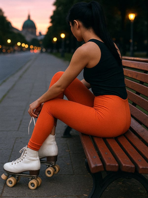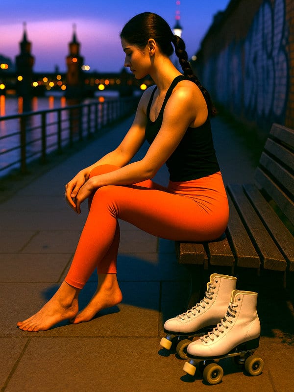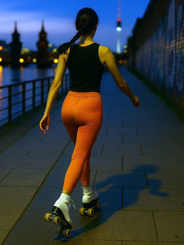 She came cruising down the Spreeufer path near Oberbaumbrücke. Effortless. Fluid. Her body leaned slightly with each curve, long legs in bright orange leggings, white retro skates catching the last orange light. Black hair in a single sleek braid. Always facing forward. No glance back. Just presence.