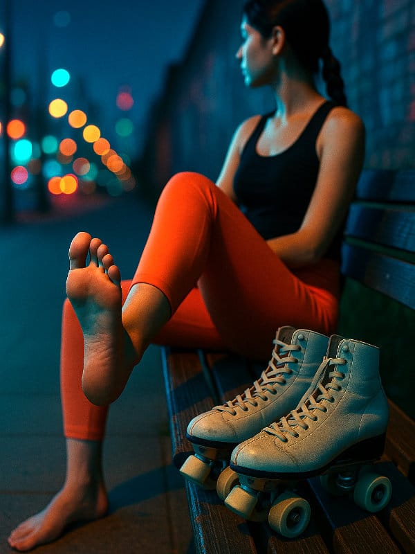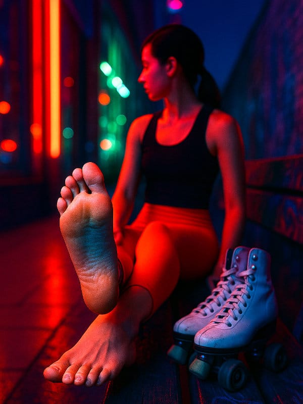 She leaned back against a low wall, the wheels of her skates catching neon reflections. The orange leggings hugging her legs made every angle count. I crouched down, focused on the lines, the shadows, the slightly dusty soles of her skates.