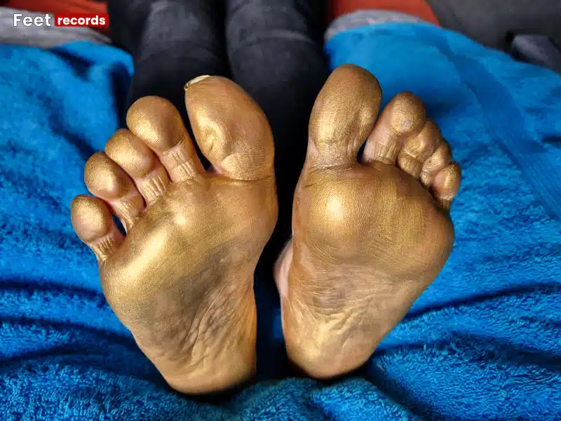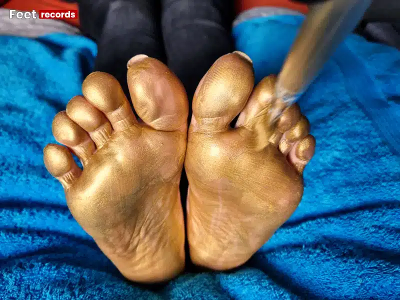 Prepare to be amazed as BlaqCat unveils her exceptional painted soles and toes. With an artistic eye and a steady hand, we effortlessly transform her feet into living works of art. With a metallic golden color, BlaqCat’s soles make them look statuesque and show the passion of foot fetishism. Each moment tells a unique story, capturing the essence of her feet and providing a visual feast for foot enthusiasts and art lovers alike.